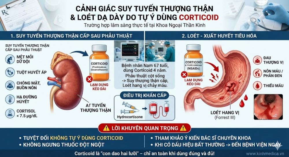 Trường hợp trên là lời cảnh báo quan trọng về nguy cơ suy tuyến thượng thận và loét dạ dày do lạm dụng corticoid – một vấn đề vẫn còn phổ biến trong cộng đồng.