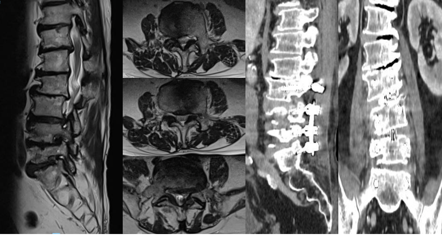 Hình 2. Cộng hưởng từ cột sống trước phẫu thuật với hẹp ống sống đa tầng từ L3-S1, và hình ảnh cắt lớp vi tính sau phẫu thuật với phương tiện KHX L3L4L5S1 đúng vị trí