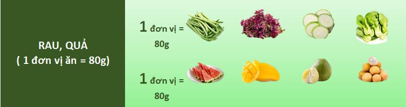 - Trái cây/quả chín: người trưởng thành nên sử dụng 3 đơn vị trái cây/quả chín một ngày.
