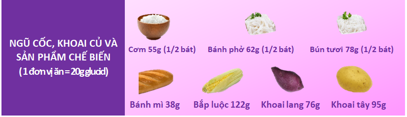 Nhóm cung cấp chất bột đường: gạo, bún, phở, bánh mì, ngô, khoai và các sản phẩm chế biến. Đây là nhóm thực phẩm cung cấp nguồn năng lượng chủ yếu cho cơ thể.