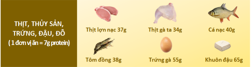 Nhóm cung cấp chất đạm: thịt, cá, các loại thủy hải sản, trứng, sữa, các loại đậu hạt và các sản phẩm chế biến. Hằng ngày, nên ăn ít nhất 2 loại thực phẩm trong nhóm này. Trong một tuần nên thay đổi các loại thực phẩm nói trên, 1 tuần nên ăn ít nhất 3 bữa cá.
