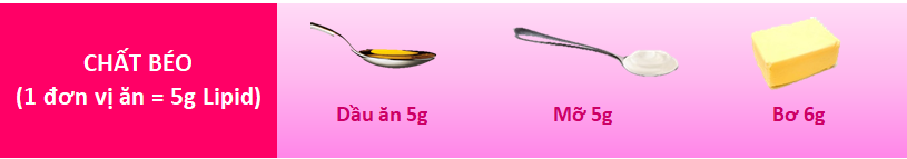 Nhóm cung cấp chất béo: dầu, mỡ, các loại hạt có dầu (lạc, vừng...). Nên ăn dầu thực vật, dầu cá, hạn chế mỡ động vật. Người trưởng thành nên sử dụng 5-6 đơn vị ăn dầu, mỡ một ngày.