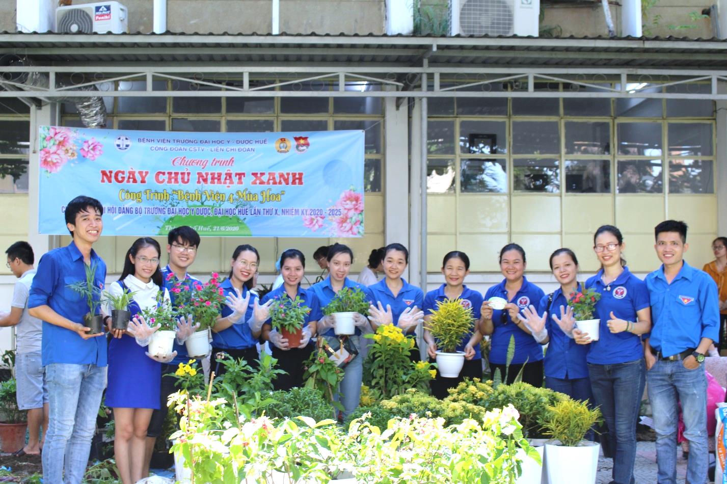 Thực hiện kế hoạch hoạt động năm 2020, nhằm tiếp tục công tác cải tạo cảnh quan, tạo môi trường Bệnh viện xanh, sạch, đẹp và thân thiện; thực hiện Đề án Ngày Chủ nhật xanh “Hãy hành động để Thừa Thiên Huế thêm Xanh – Sạch – Sáng” của UBND Tỉnh Thừa Thiên Huế; thiết thực chào mừng Đại hội Đảng bộ Trường Đại học Y Dược, Đại học Huế nhiệm kỳ 2020 – 2025, được sự đồng ý của Ban Giám đốc Bệnh viện, sáng ngày 21/6/2020, Ban chấp hành Công đoàn CSTV và Ban chấp hành Liên Chi đoàn Bệnh viện Trường Đại học Y – Dược Huế đã tổ chức Chương trình “Ngày Chủ nhật xanh”, triển khai Công trình “Bệnh viện 4 mùa hoa”.