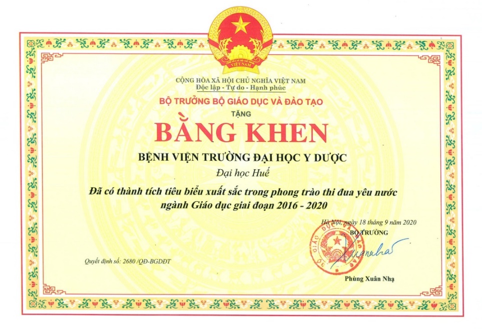 Ngày 23/9/2020, tại Đại hội thi đua yêu nước ngành Giáo dục lần thứ VII do Bộ Giáo dục - Đào tạo tổ chức tại Hà Nội, Bệnh viện Trường Đại học Y Dược Huế vinh dự được nhận bằng khen của Bộ trưởng Bộ Giáo dục và Đào tạo vì đã có thành tích tiêu biểu xuất sắc trong phong trào thi đua yêu nước ngành Giáo dục giai đoạn 2016-2020. Cùng dự đại hội có đại diện lãnh đạo Đảng, Nhà nước; đại diện một số ban, bộ, ngành Trung ương, địa phương và gần có gần 700 đại biểu đại diện cho các tập thể và cá nhân được đề nghị khen thưởng và các danh hiệu trong cả nước.