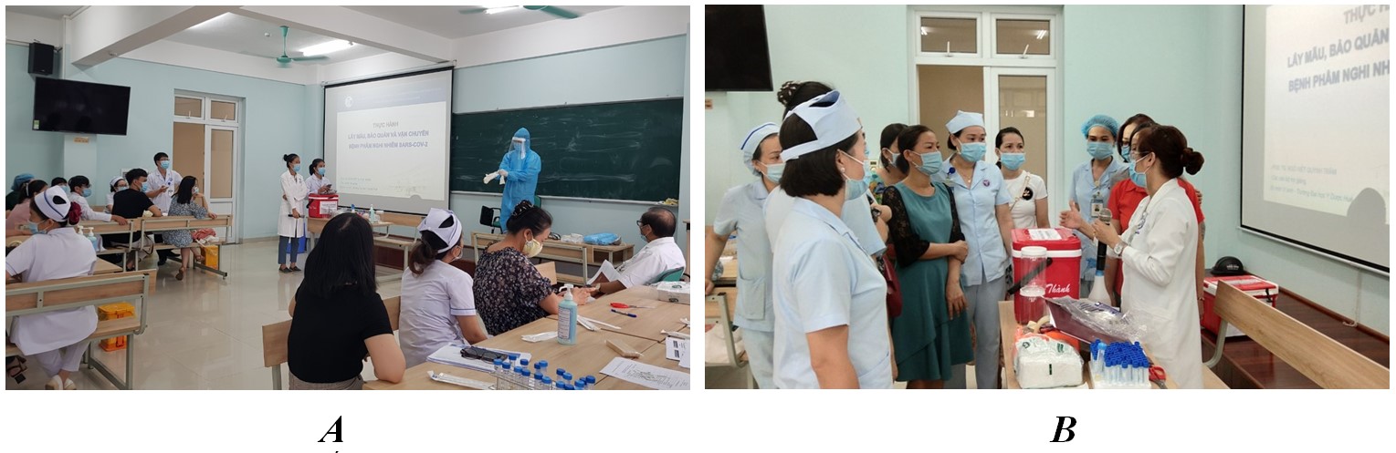 Hình 2: A.Tập huấn sử dụng phương tiện bảo hộ; B.Tập huấn cách lấy mẫu, bảo quản, vận chuyển mẫu bệnh phẩm dịch hầu họng