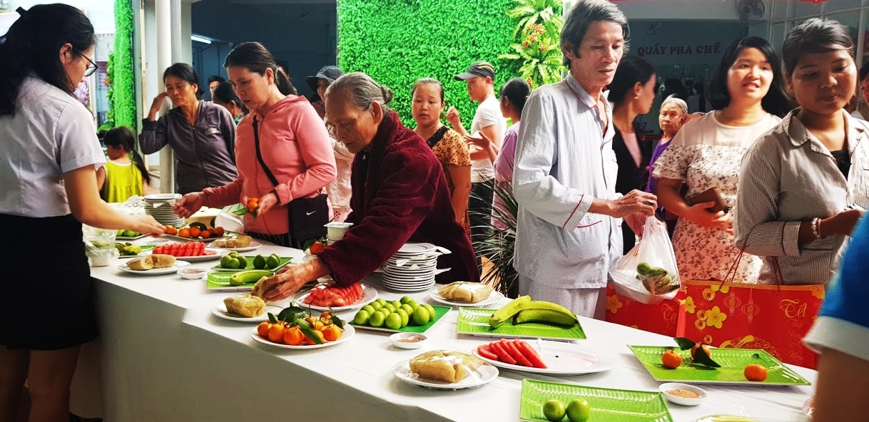 Cuối chương trình, bệnh nhân và người nhà còn được thưởng thức những suất cơm trưa miễn phí cùng tiệc buffet trái cây như một bữa tiệc trước thềm năm mới.