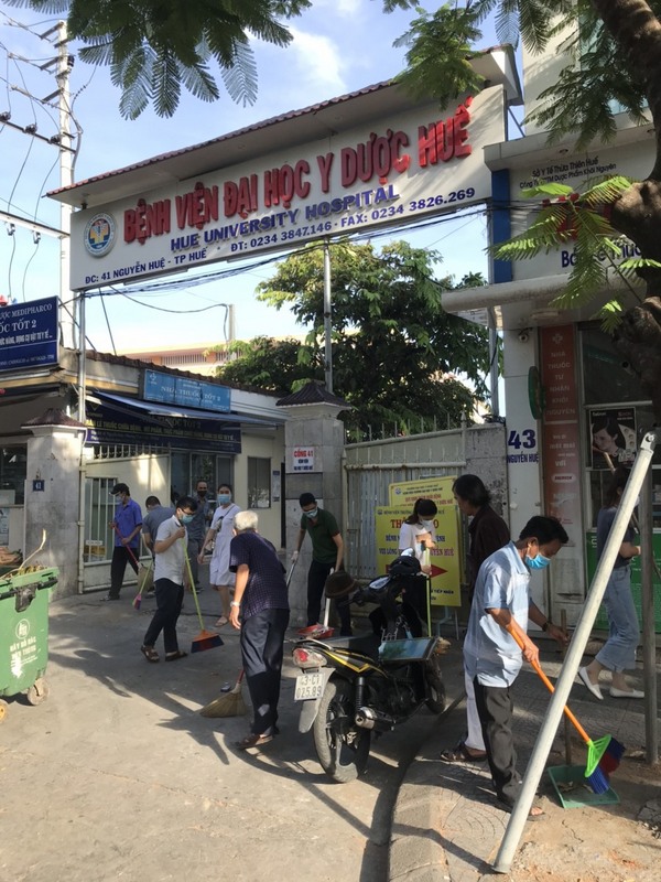 Thực hiện chỉ đạo của Giám đốc Bệnh viện Trường Đại học Y Dược Huế, Liên chi Đoàn Bệnh viện, Đội phản ứng nhanh Phòng chống lụt bão đã tổng vệ sinh khuôn viên Bệnh viện, theo đúng tinh thần của “Ngày Chủ nhật xanh”. Theo đó, các lối đi, hành lang và cổng vào của Bệnh viện đã được dọn dẹp.