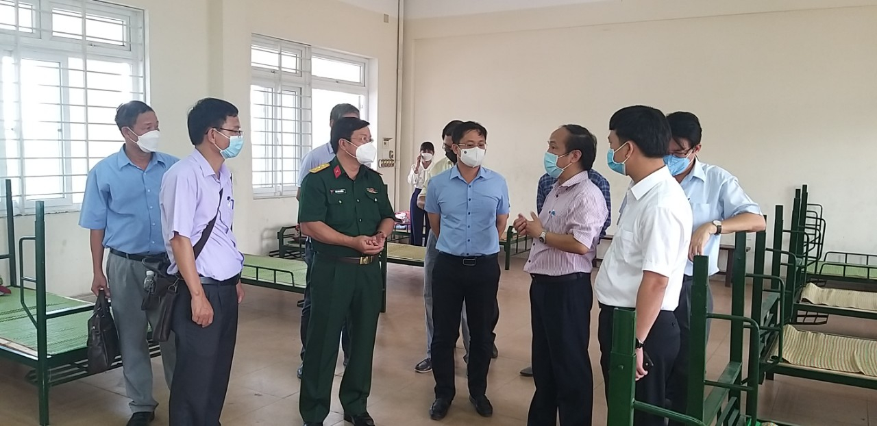 Các đồng chí lãnh đạo kiểm tra công tác triển khai hoạt động tại cơ sở cách ly điều trị tại Trường Cao đẳng nghề số 23