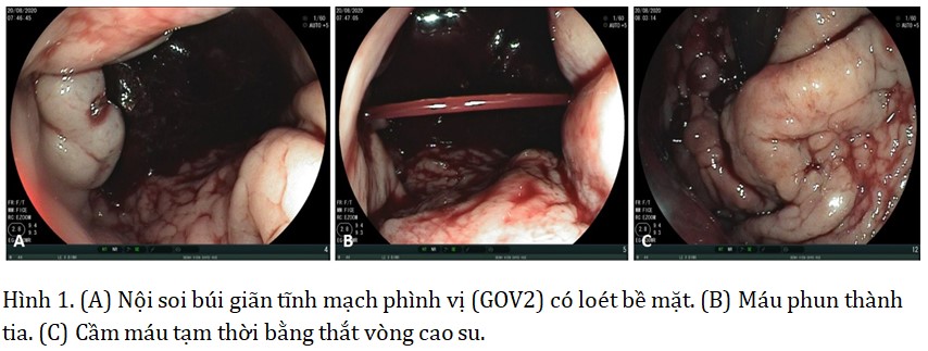 Bệnh nhân tiếp tục nôn ra máu dù được điều trị nội khoa tích cực. Nội soi dạ dày cấp cứu ngay rạng sáng ngày 20/08/2020 ghi nhận hình ảnh ổ loét bề mặt búi giãn tĩnh mạch tâm vị (GOV2) đang chảy máu thành tia và được thắt cầm máu tạm thời bằng vòng cao su. Ngay sau can thiệp, huyết động bệnh nhân không ổn định, huyết áp tụt (70/40mmHg), mạch 110 - 120 lần/phút. Tiến hành hồi sức, truyền máu tích cực, huyết động cải thiện dần nhưng nguy cơ xuất huyết tái phát là rất cao do thắt vòng cao su không phải là phương tiện cầm máu tối ưu cho xuất huyết GOV2. Sau khi hội chẩn đa chuyên khoa, bệnh nhân được chỉ định chụp và điều trị nút búi giãn tĩnh mạch dạ dày ngược dòng (BRTO/PARTO).