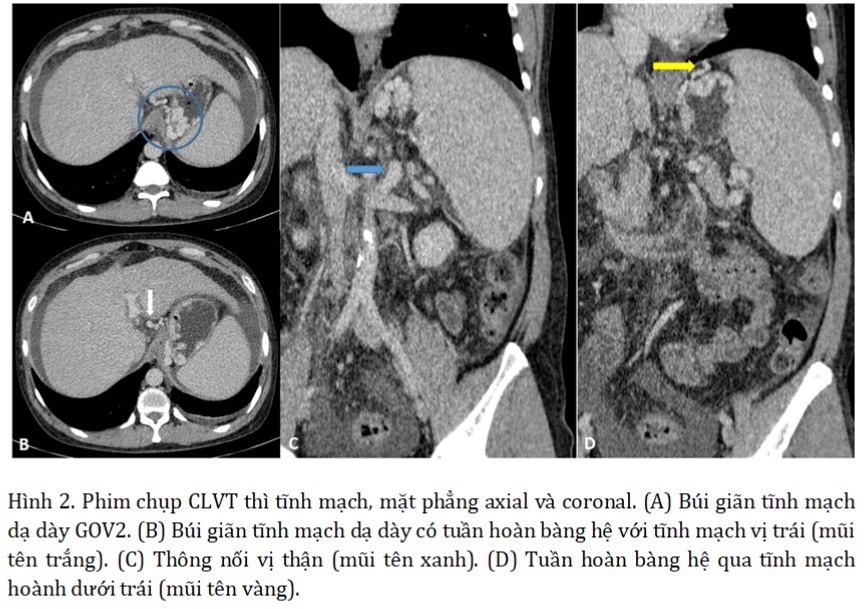 Phim chụp CLVT của bệnh nhân 1 tháng trước cho thấy nhiều búi giãn tĩnh mạch ngoằn ngoèo ở phình vị dạ dày có nhiều tuần hoàn bàng hệ đổ về tĩnh mạch chủ dưới qua hệ tĩnh mạch vị hoành (gastrophrenic venous system), có thông nối vị - thận (gastrorenal shunt - GRS). Đường kính chỗ lớn nhất của thông nối là 13 mm. Đây là yếu tố quyết định cho phép lựa chọn phương pháp BRTO/PARTO.