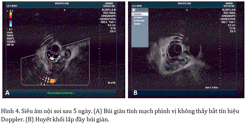Sau thủ thuật, bệnh nhân có biểu hiện sốt nhẹ và đau tức bụng và được theo dõi kỹ tại Khoa Nội tổng hợp. Sau 2 ngày, bệnh nhân hết các triệu chứng, không còn nôn ra máu hay đi cầu phân đen, các xét nghiệm cải thiện dần (Hb: 85 g/l).