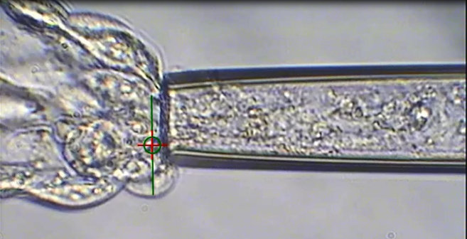 Hình 2: Thao tác lấy một số tế bào của phôi nang để thực hiện phân tích di truyền. Thao tác được tiến hành dưới độ phóng đại 600 lần cùng hệ thống vi thao tác và hỗ trợ của hệ thống Laser Saturn 5 active.