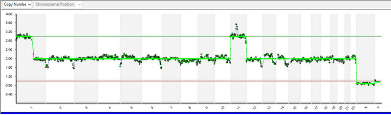 Hình 3: Một đột biến số lượng và cấu trúc nhiễm sắc thể được phát hiện trong quá trình phân tích chẩn đoán di truyền trước làm tổ được thực hiện tại trung tâm. Đột biến lệch bội nhiễm sắc thể số 11 và bất thường cấu trúc (thêm đoạn 132,4 Mb tại nhiễm sắc thể 1s).