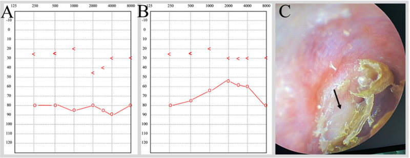 Hình 2: Đánh giá kết quả phẫu thuật trên thính lực đồ và nội soi, A thính lực đồ trước phẫu thuật với air bone gap rộng 50dB trung bình ở 4 tần số, B thính lực đồ sau phẫu thuật với sự cải thiện đáng kể sức nghe với ABG 36 dB, C màng nhĩ đóng kín hoàn toàn với hình ảnh đầu xương búa tiếp xúc với màng nhĩ tại vị trí mới của nó