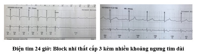 Kết quả điện tim 24 giờ cho thấy tim vẫn còn block nhĩ thất cấp 3 và có nhiều khoảng ngưng tim dài 8 giây.