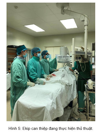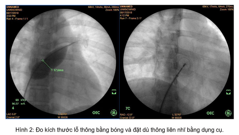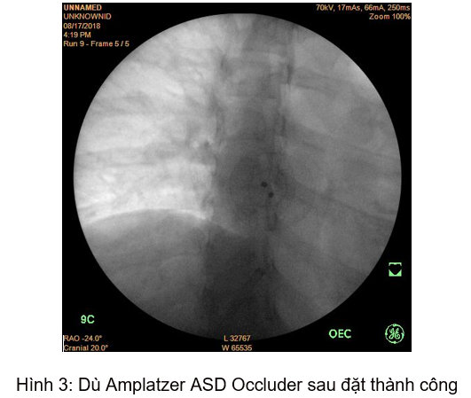Xác định đây là nguyên nhân gây ra các triệu chứng trên bệnh nhân cũng như khảo sát kỹ cho thấy hình thái cấu trúc, chức năng tim phù hợp, bệnh nhân đã được chỉ định điều trị bằng phương pháp đóng lỗ thông liên nhĩ bằng dù Amplatzer ASD Occluder đường kính 18 mm qua da bằng dụng cụ dưới hướng dẫn của hệ thống tăng sáng số hóa xóa nền và siêu âm tim doppler màu.