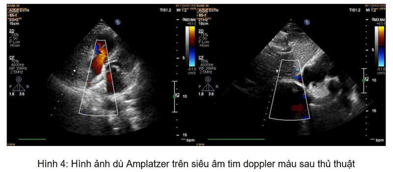 Thủ thuật được tiến hành một cách nhanh chóng, an toàn và không xuất hiện biến chứng. Sau thủ thuật, triệu chứng bệnh nhân cải thiện một cách rõ rệt, không còn hồi hộp, khó thở. Kiểm tra lại trên siêu âm tim doppler màu cho thấy lỗ thông liên nhĩ đã được đóng hoàn toàn, không còn dòng chảy bất thường.