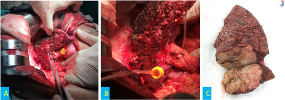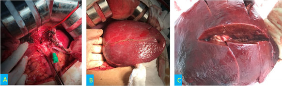 Hình 3. A. Diện cắt gan hạ phân thùy 4 trong mổ. B. Vị trí thiếu máu phân thùy sau sau khi thắt cuống phân thùy sau. C. Bệnh phẩm u gan 2 vị trí sau mổ cắt gan phải.
