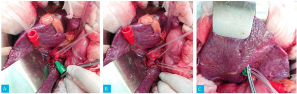 Hình 4. A. Phẫu tích cuống hạ phân thùy 6 Takasaki ( đầu sonde màu xanh). B. Bộc lộ cuống hạ phân thùy 6. C. Diện thiếu máu đã đánh dấu ở hạ phân thùy sáu.