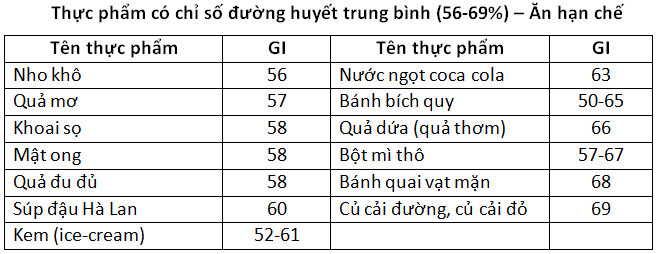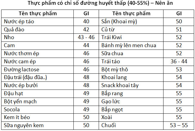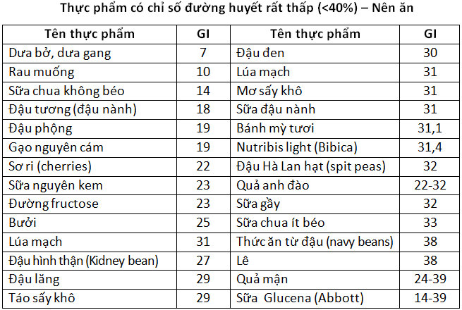 ->Ưu tiên chọn thực phẩm có chỉ số đường huyết thấp (là thực phẩm có khả năng gây tăng đường huyết ít và từ từ sau khi ăn) (BẢNG 1).
