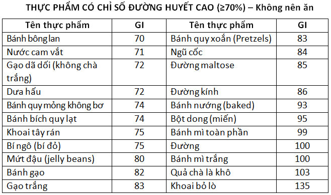 CHỈ SỐ ĐƯỜNG HUYẾT (GI) CỦA MỘT SỐ THỰC PHẨM
