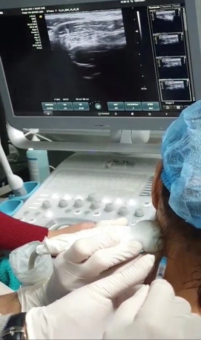 Phối hợp với Bác sĩ chẩn đoán hình ảnh để chích bệnh nhân LTLC cổ dưới hướng dẫn siêu âm