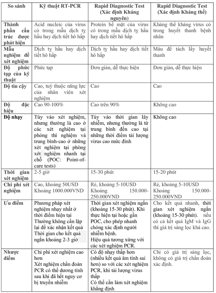 Để hiểu rõ hơn và chọn lựa hiệu quả kỹ thuật xét nghiệm này, bài viết tóm lược giới thiệu và so sánh giá trị các kỹ thuật xét nghiệm hiện nay góp phần cho các cơ sở y tế có cơ sở lựa chọn kỹ thuật phù hợp, đáp ứng yêu cầu phòng chống dịch bệnh trong điều kiện của mình.