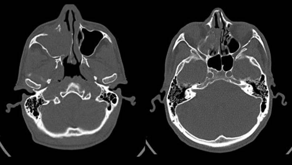 Hình 1: Khối u lớn ở xoang hàm phải, phá hủy thành xoang và xâm lấn rộng vào hốc mũi và xoang sàng cùng bên