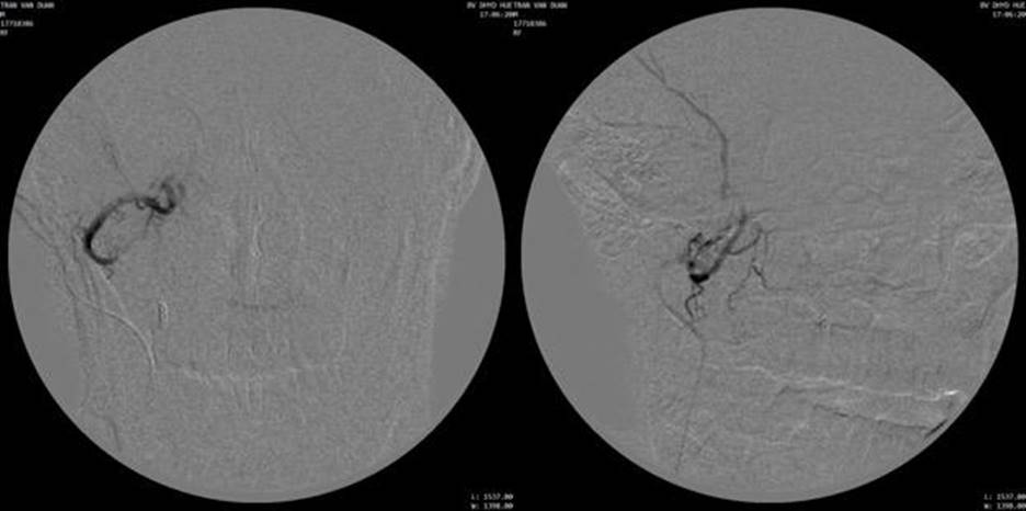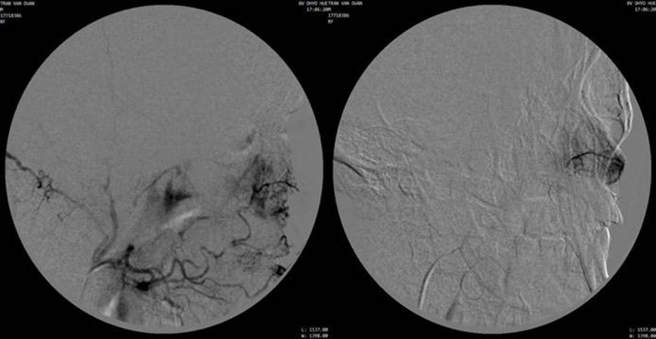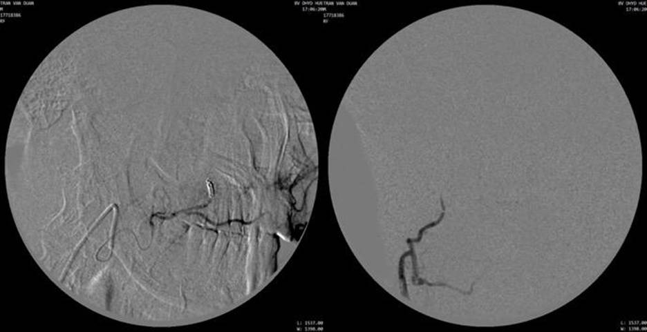 Chọn lọc động mạch hàm, tiếp cận động mạch huyệt răng sau trên. Chụp chọn lọc thấy khối tăng sinh mạch với hình ảnh tumor network. Bơm tắc ngoại vi bằng hạt PVA 250-355μm. Nút tắc gốc bằng 01 detachable coil Interlock 5x150mm.