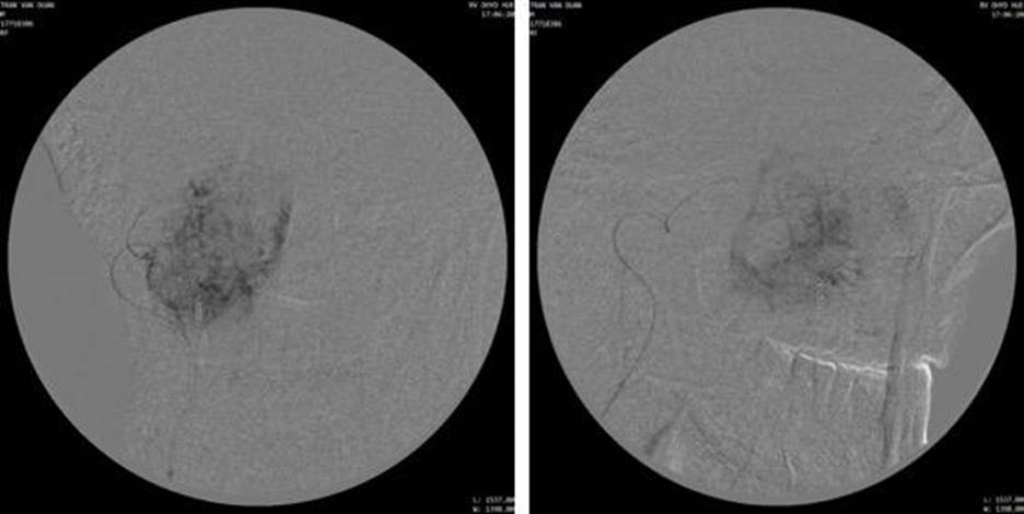 Chụp kiểm tra thấy tắc hoàn toàn mạch nuôi u, không thấy phần u ngấm thuốc.
