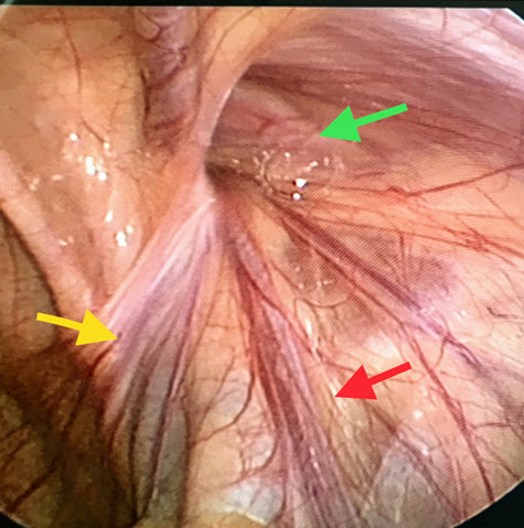Ảnh 2: Quan sát qua nội soi: lỗ bẹn sâu (mũi tên xanh lục), bó mạch sinh dục (mũi tên đỏ), ống dẫn tinh (mũi tên vàng)