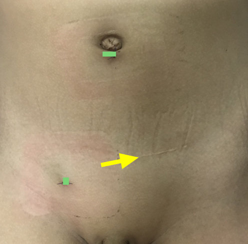 Ảnh 5: Vết rạch da nhỏ (xanh lục), không cần khâu da. Vết mổ cũ thoát vị bẹn bên trái cách 4 năm (mũi tên vàng)