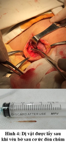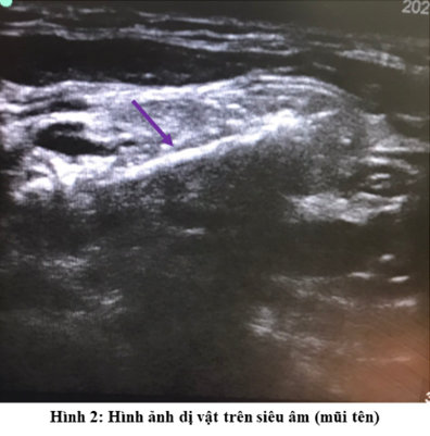 Bệnh nhân đến lúc này được phẫu thuật cấp cứu mở cạnh cổ lấy dị vật, trong quá trình phẫu thuật với sự trợ giúp của siêu âm đã lấy ra được dị vật là một mảnh xương cá đường kính 2 mm, chiều dài 20 mm. Thám sát đường dò đến tận TQ hút được khoảng 10 ml dịch mủ trắng đục và tiến hành súc rửa đường dò bằng betadin. Sau đó dẫn lưu qua da đường dò và đóng vết mổ. Hậu phẫu ngày thứ 3 tiến hành để hở vết mổ 1/3 dưới mục đích chăm sóc và dẫn lưu đường dò. Bệnh nhân được xuất viện một tuần sau đó với tình trạng ổn định và sẽ được đóng đường dò thì hai sau đó.