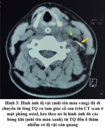 Bệnh nhân được phẫu thuật nội soi thực quản ống cứng để lấy dị vật, tuy nhiên, không phát hiện dị vật trong lòng TQ. Bênh nhân được thực hiện xét nghiệm bổ sung bao gồm siêu âm, CT scan và đã phát hiện dị vật đã di chuyển ra tam giác cổ sau. Thêm vào đó, trên đường di chuyển của mình dị vật để lại hình ảnh dò các bóng khí từ TQ đến ổ thâm nhiễm có dị vật cản quang.
