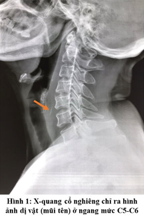Bệnh nhân L.T.T.T, nữ, 49 tuổi, địa chỉ phường An Tây, Huế, vào viện với lý do nuốt đau, sưng nề vùng cổ trái. Bệnh nhân khai đã mắc xương cá đuối 3 ngày trước đó, không đi khám và xử trí gì và được chỉ định nội soi hạ họng - thanh quản không phát hiện dị vật, sau đó được chụp phim Xquang cổ nghiêng phát hiện dị vật ở ngang mức C5-C6.