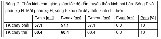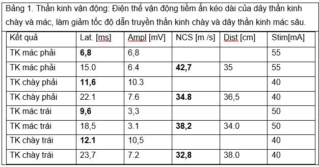 Cận lâm sàng: Bạch cầu 5,73 K / µL, huyết sắc tố 16,2 g / dL, hematocrit 46,7%, tiểu cầu 336 K / µL, glucose huyết thanh 99 mg / dL, urê 5,74 mmol / L, creatinin 71,3 mmol / L. Điện cơ: Thần kinh vận động: Điện thế vận động tiềm ẩn kéo dài của dây thần kinh chày và xương mác, giảm tốc độ dẫn truyền dây thần kinh chày và dây thần kinh mác sâu (Bảng 1). Thần kinh cảm giác: giảm tốc độ dẫn truyền thần kinh hai bên. Sóng F và phản xạ H: Mất phản xạ H, sóng F kéo dài dây thần kinh chi dưới (Bảng 2).