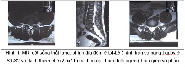 Dịch não tủy: ít hồng cầu, 99% bình thường, cấy nấm âm tính, không quan sát thấy bạch cầu, glucose 4,51 mmol / L, protein 1,42g / L, phản ứng Pandy dương tính. Chụp cộng hưởng từ (MRI) cột sống thắt lưng cho thấy lồi đĩa đệm ở mức L4-L5 và nang Tarlov ở mức S1-S2 với kích thước 4,5x2,5x11 cm chèn ép chùm đuôi ngựa (Hình 1).