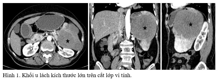 Bệnh nhân nữ 64 tuổi, vào viện vì đau vùng hạ sườn trái. Chụp cắt lớp vi tính ghi nhận lách lớn, trong nhu mô có nhiều khối choán chỗ bờ không đều, giới hạn khá rõ, đẩy lồi bao lách, chèn ép các tạng lân cận nhưng chưa thấy rõ xâm lấn (Hình 1). Khối lớn nhất có kích thước #10.5x10x9.5cm, trung tâm có hoại tử. Các khối này ngấm thuốc kém qua các thì. Vài tổn thương nhỏ tương tự ở gan, kích thước 7-15mm. Không phát hiện thêm bất thường nào khác. Bệnh nhân được chỉ định sinh thiết lách (Hình 2). Vì nguy cơ chảy máu khi sinh thiết lách, chúng tôi quyết định sử dụng kỹ thuật kim đồng trục có nút tắc đường hầm (Hình 3). Sau sinh thiết bệnh nhân đau tức nhẹ ở vùng hạ sườn trái, huyết động ổn định, không có tai biến tức thì và biến chứng muộn. Kết quả giải phẫu bệnh là angiosarcoma lách.
