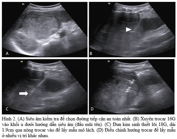 Đối với sinh thiết lách, siêu âm hướng dẫn thường được sử dụng hơn so với cắt lớp vi tính và cộng hưởng từ do có nhiều ưu điểm như sẵn có, dễ di chuyển, thời gian thực, không nhiễm xạ, linh hoạt trong việc tiếp cận tổn thương từ nhiều hướng và giá thành thấp [7]. Hiện nay, Khoa Chẩn đoán hình ảnh Bệnh viện Trường Đại học Y Dược Huế đã triển khai thành công kỹ thuật này trên 3 bệnh nhân với tất cả các mẫu đều đạt tiêu chuẩn chẩn đoán và không có biến chứng sau thủ thuật.