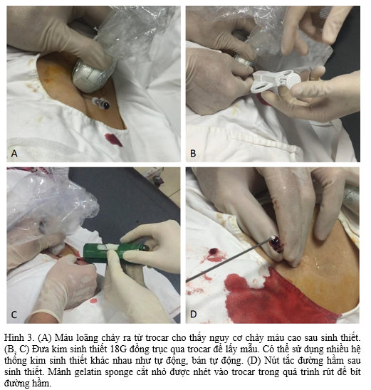 Trước đây, việc lấy mẫu tổn thương lách được thực hiện chủ yếu là chọc hút tế bào bằng kim nhỏ (fine needle aspiration) hoặc sinh thiết lõi kim nhỏ 20-22G. Việc sử dụng kim nhỏ giúp hạn chế biến chứng của thủ thuật nhưng đôi khi không đảm bảo lấy đủ mẫu mô cho chẩn đoán mô bệnh học và hóa mô miễn dịch[1, 7]. Ngược lại sinh thiết lõi với kim lớn (14G) có tỷ lệ tai biến cao, 13% chảy máu nặng cần truyền máu hoặc cắt lách [8]. Kỹ thuật sinh thiết đồng trục (coaxial) được giới thiệu nhằm hạn chế số lần chọc qua nhu mô, do vậy hạn chế đươc tại biến và giảm thời gian thủ thuật. Tuy nhiên, nhược điểm của kỹ thuật này là nguy cơ chảy máu sau khi rút kim do thời gian lưu kim cỡ lớn (16G) liên tục trong nhu mô dẫn đến nguy cơ rách nhu mô lách [7]. Vì vậy, để hạn chế nguy cơ chảy máu mà vẫn đảm bảo lấy đủ mẫu mô cần thiết, chúng tôi ứng dụng kỹ thuật sinh thiết lõi đồng trục với trocar 16G, kim sinh thiết 18G, lõi 1.9cm (Magnum, Bard) và nút tắc đường hầm bằng gelatin sponge cắt nhỏ trong khi rút kim. Mặc dù cho đến nay, chưa có thử nghiệm lâm sàng ngẫu nhiên (RCT) nào so sánh hiệu quả của nút tắc đường hầm sau sinh thiết lách, tuy nhiên nhiều trung tâm trên thế giới đã áp dụng phương pháp này và cho thấy hiệu quả cầm máu tốt [5].