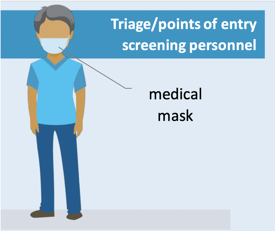 Dưới đây là các hình ảnh dễ nhớ của TCYTTG về sử dụng phương tiện phòng hộ khác nhau tuỳ theo công việc khác nhau của nhân viên y tế tại các cơ sở y tế: