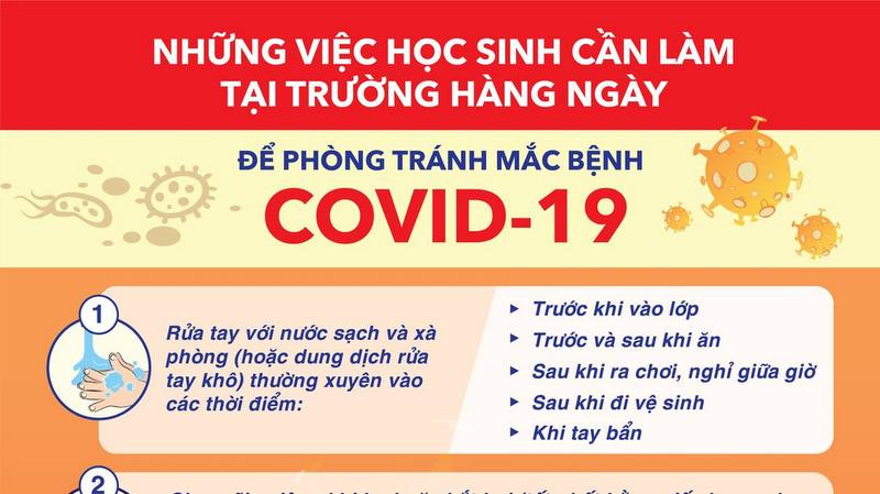 Ngày 13/3, Bộ Y tế tiếp tục có khuyến cáo phòng bệnh COVID-19 đến cộng đồng. Dưới đây là Khuyến cáo Những việc học sinh cần làm tại nhà hàng ngày và Khuyến cáo Những việc học sinh cần làm tại trường hàng ngày.