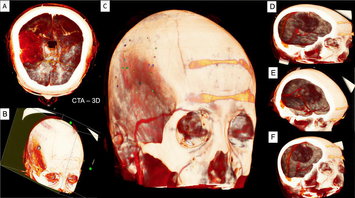Hình 1. Hình ảnh khối u tế bào quanh mạch mũi xoang. A, Hình ảnh chụp cắt lớp vi tính khối u (hình ngôi sao) gây tiêu xương (mũi tên xanh dương); B, Hình ảnh khối u đẩy ổ mắt và xoang hàm; C và D, Hình ảnh cộng hưởng từ khối lan lên xoang sàng và cửa mũi sau